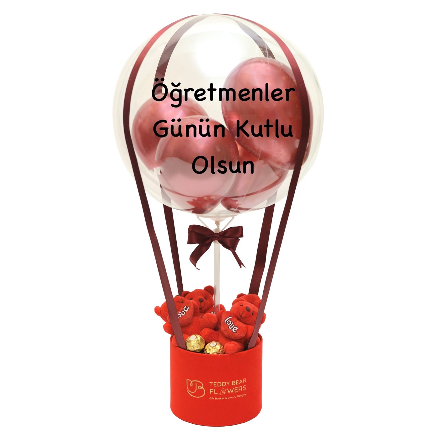 Balon Kutusu - Kırmızı Tonlar Çikolatalı | Öğretmenler Günü Özel Mesajlı | U&B Teddy Bear Flowers