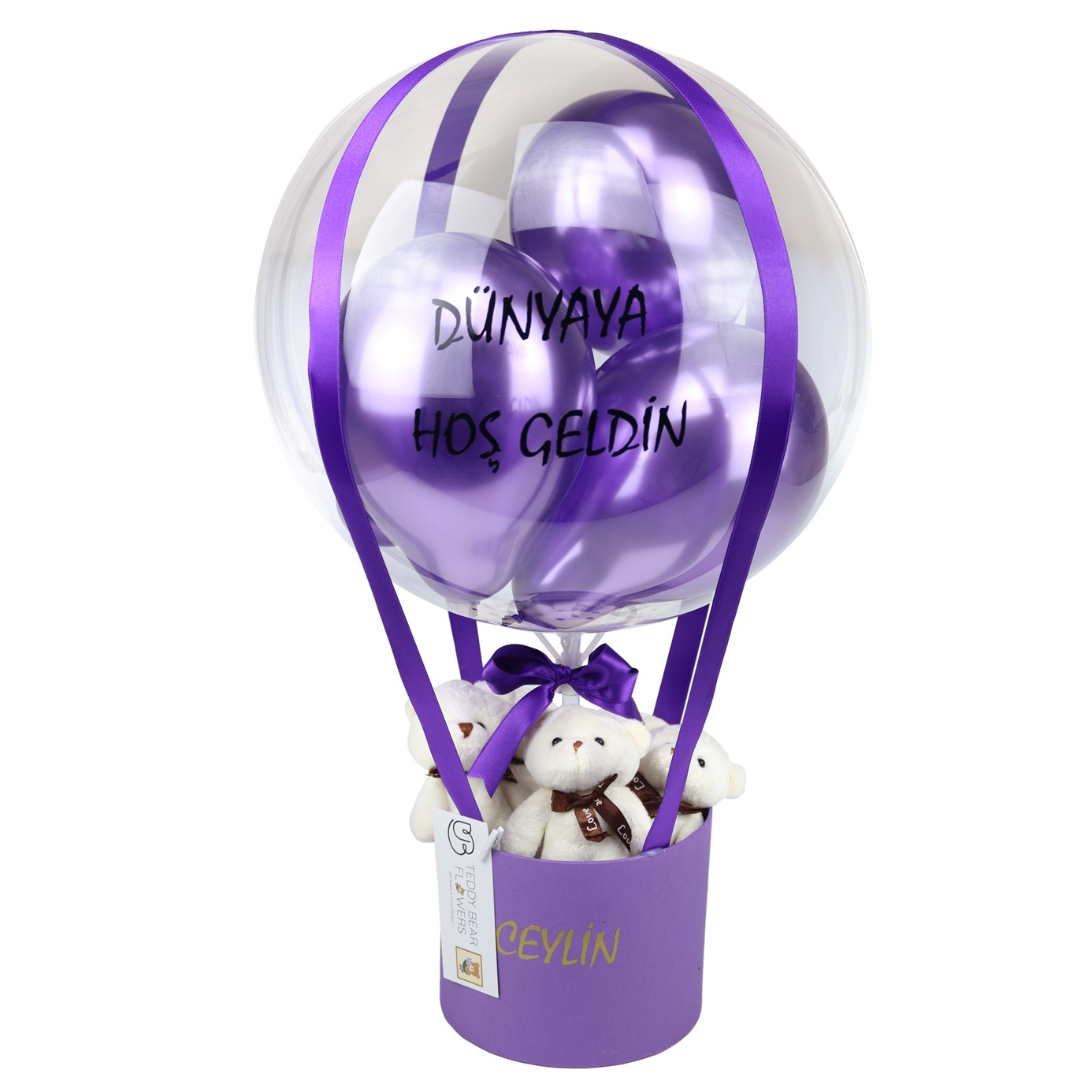 Balon Kutusu - Mor Tonlar | Kişiselleştirilebilir Hediye | U&B Teddy Bear Flowers
