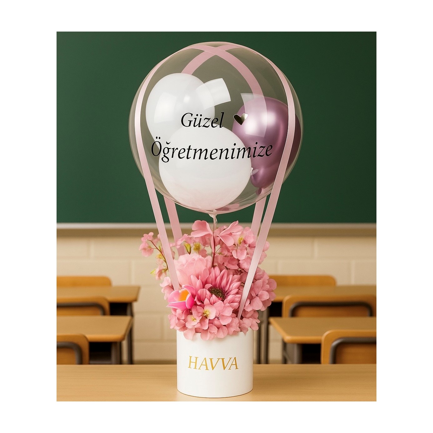 Balon Kutusu Beyaz & Pembe Çiçekli | Kişiselleştirilebilir Öğretmen Tasarımı