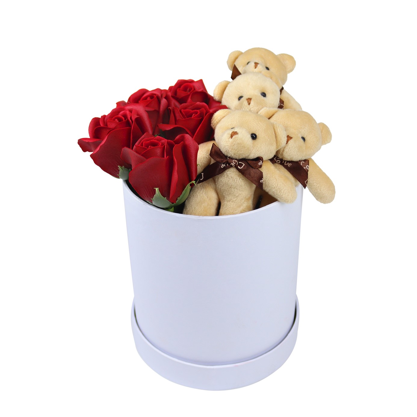 Beyaz Silindir Kutuda Kırmızı Islak Güller & Sevimli Ayıcıklar