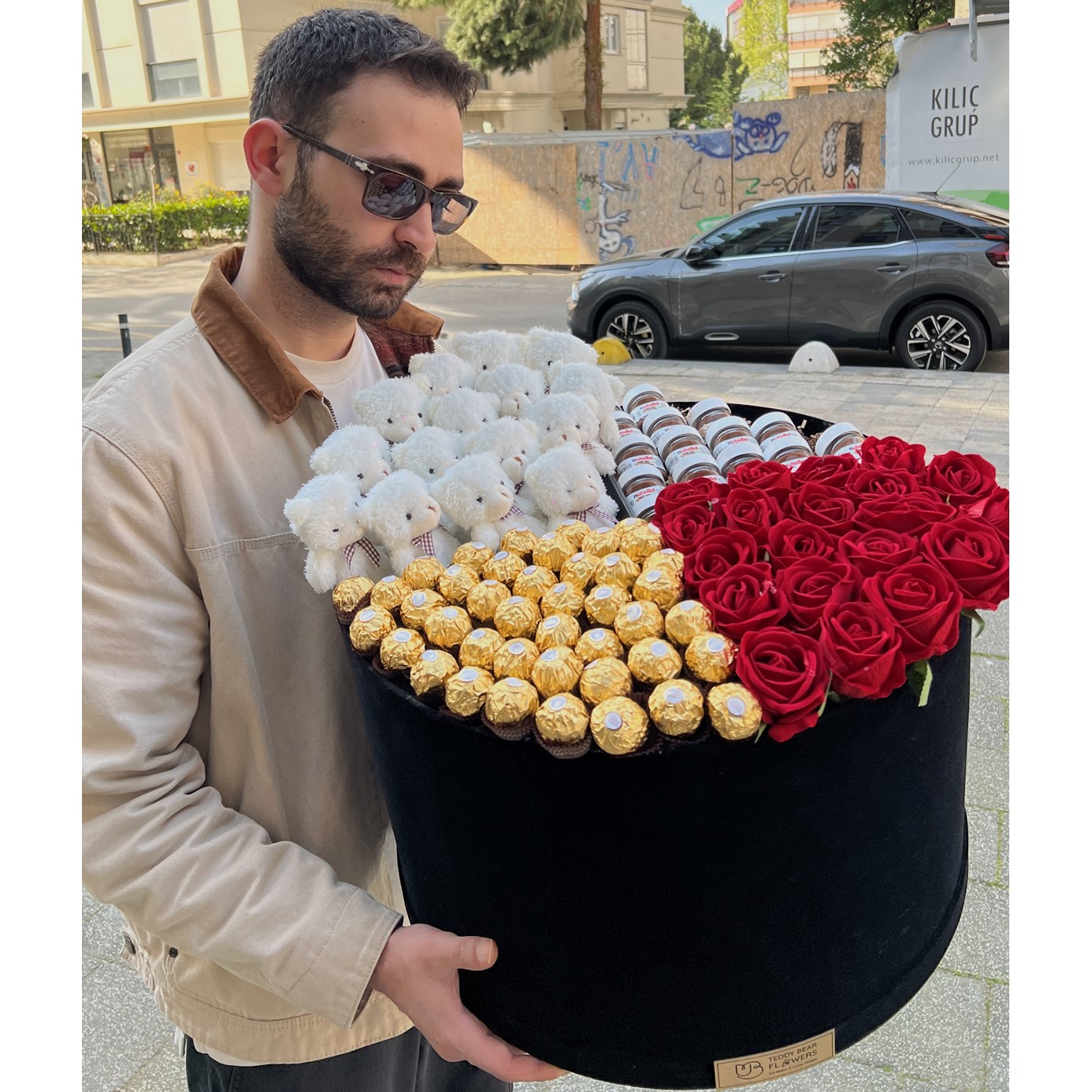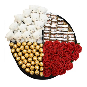 İçerisinde 15 adet tüylü beyaz ayıcık, 19 adet 25 gram nutella, 42 adet Ferroro Rocher çikolata, 20 adet kırmızı yapay gül bulunmaktadır.