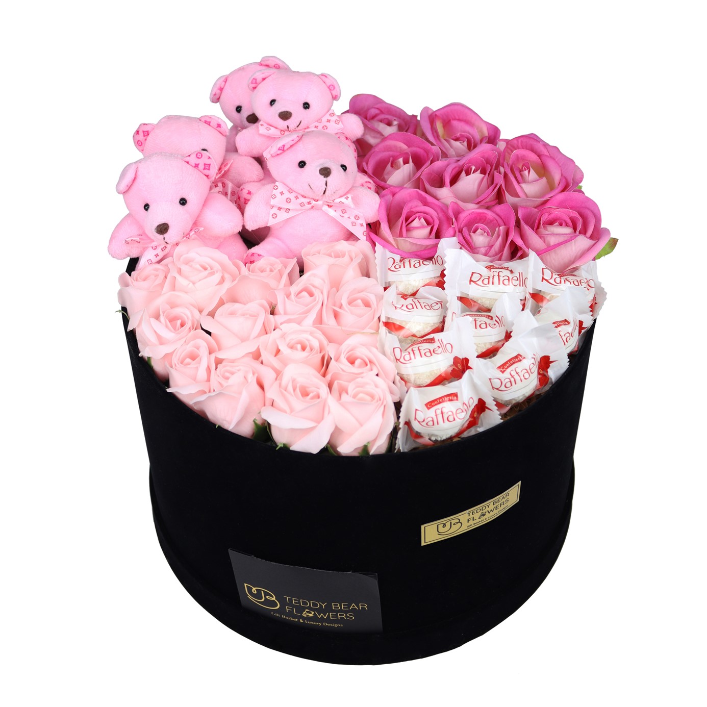 İçerisinde 13-18 adet kalıcı ıslak gül, 7 adet pembe kalıcı gül, 5 adet pembe çikolata, 9 adet Raffaello çikolata bulunmaktadır.
