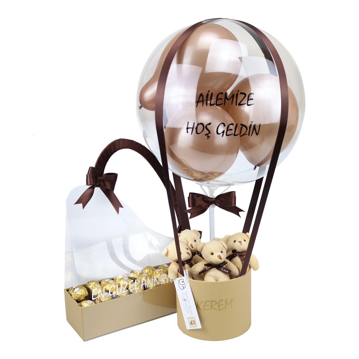 Kahverengi & Craft Balon Kutusu & Tasarım Çantada Kutulu Çikolatalar | U&B Teddy Bear Flowers