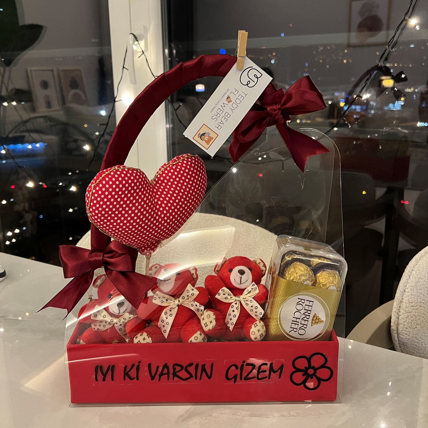 Çanta içerisinde 3 adet kırmızı peluş ayıcık, 1 adet kalp yastık ve 1 kutu 16lı ferrero rocher çikolata bulunmaktadır.