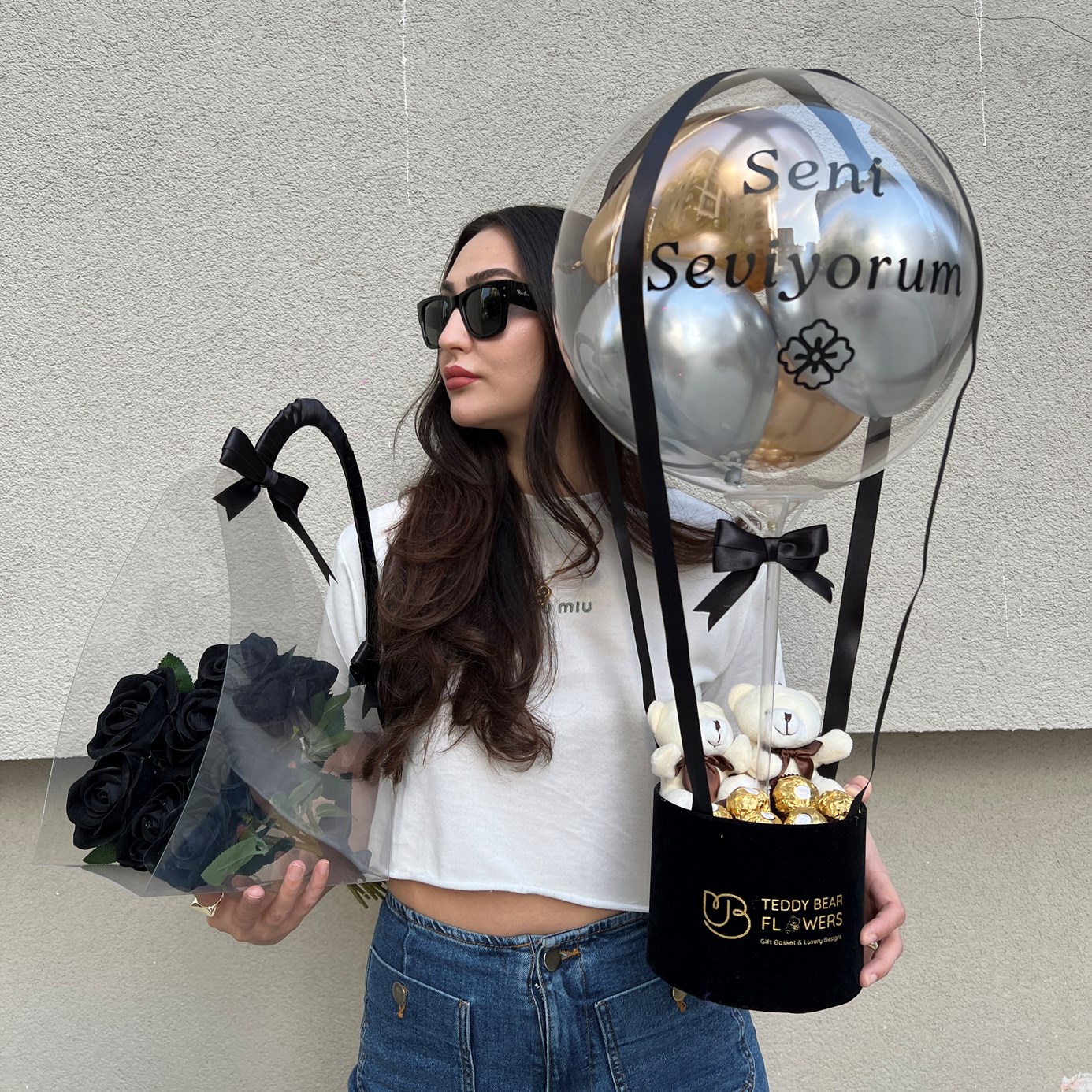 Balon kutusu içinde 2 adet peluş 11 cm ayıcık, 6 adet ferrero rocher çikolata bulunmaktadır.