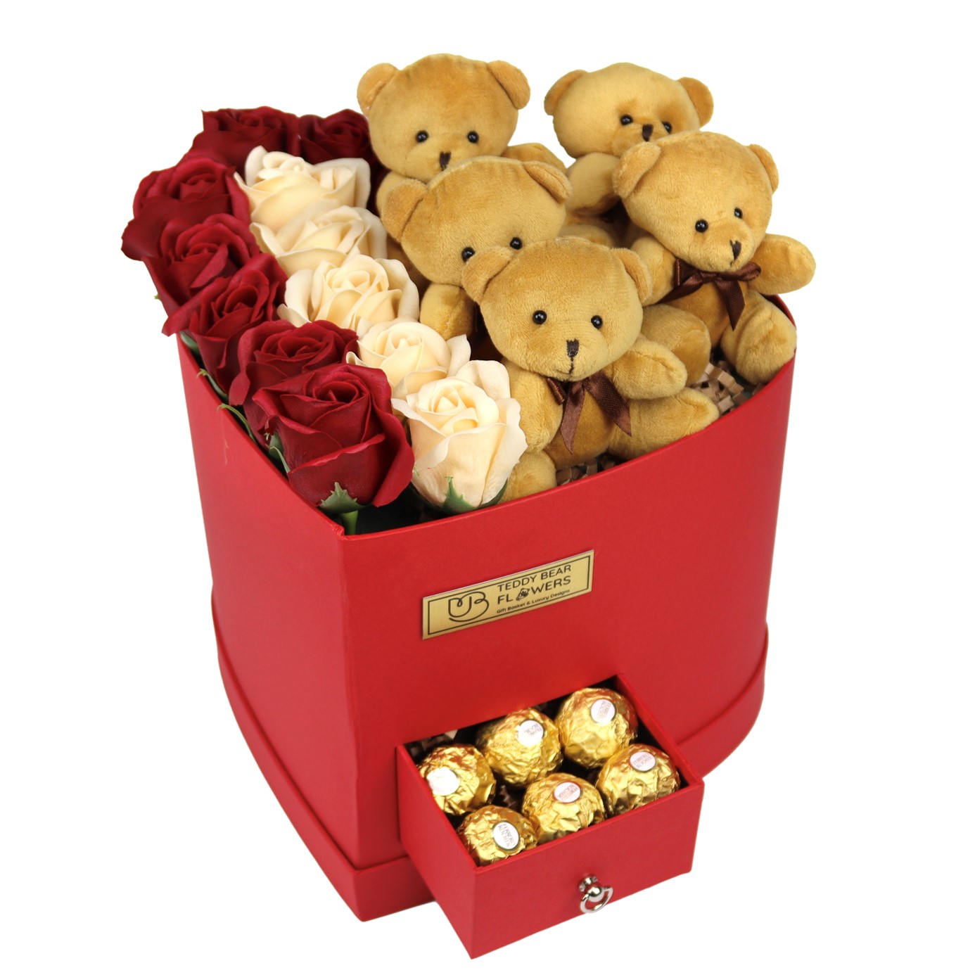 Kırmızı güller, masum ayıcıklar ve sürpriz çikolatalarla dolu bu özel kutu; “Seni her seferinde yeniden seçiyorum” demenin en tatlı yolu.