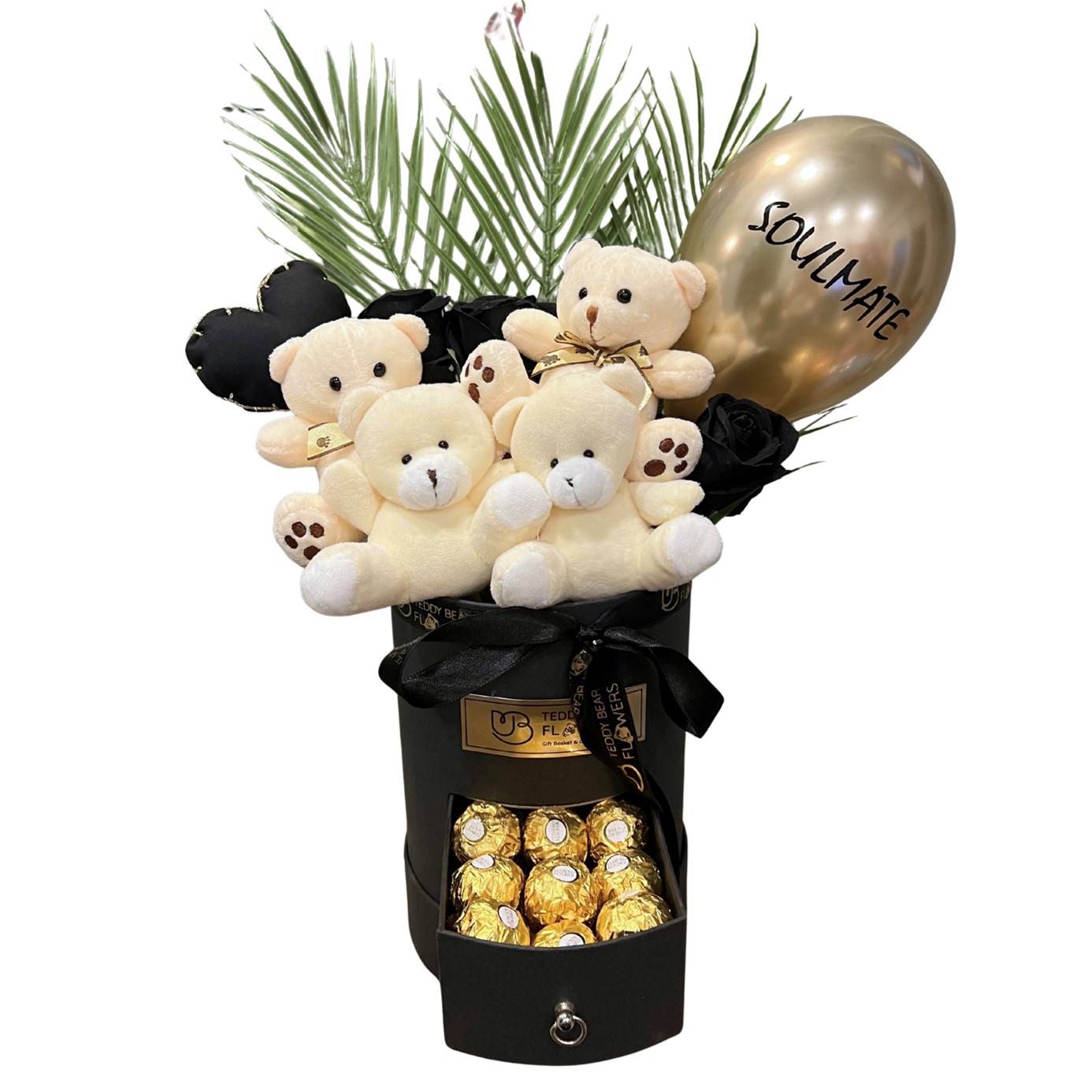 Sevgiliye Hediye Gold Balonlu Çekmeceli Kutuda Peluş Ayıcıklar, Çikolata & Siyah Güller | U&B Teddy Bear Flowers