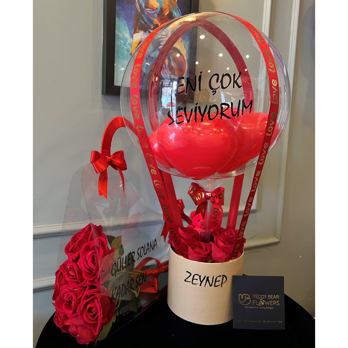 Balon içerisinde 3 adet kalpli mini balon bulunmaktadır. Balon kutusu içerisinde 6 adet kırmızı gül 1 adet love ayıcık bulunmaktadır.